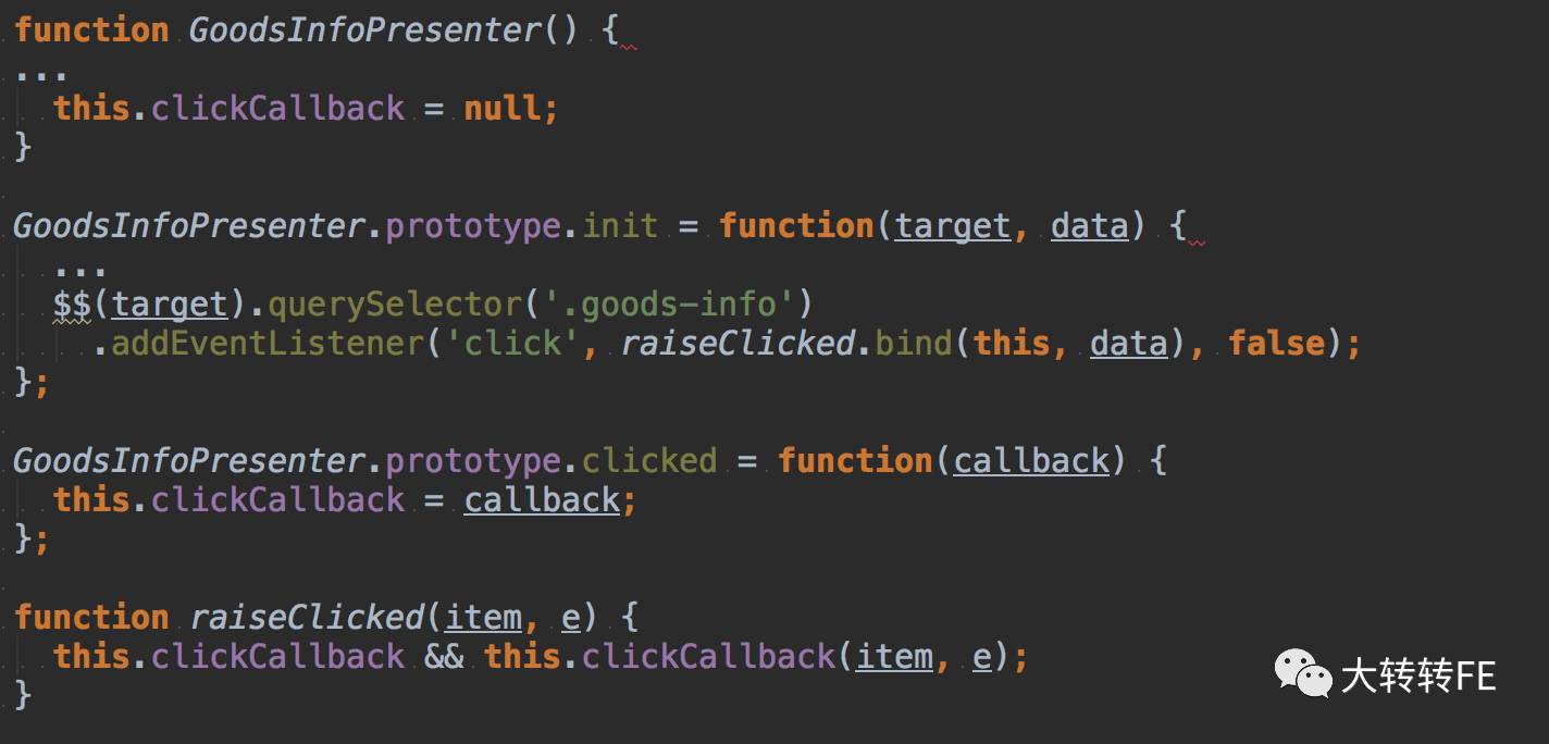 组件内部保存一个事件回调句柄 clickCallback,组件初始化时对用户点击事件进行数据绑定,并触发这个回调。