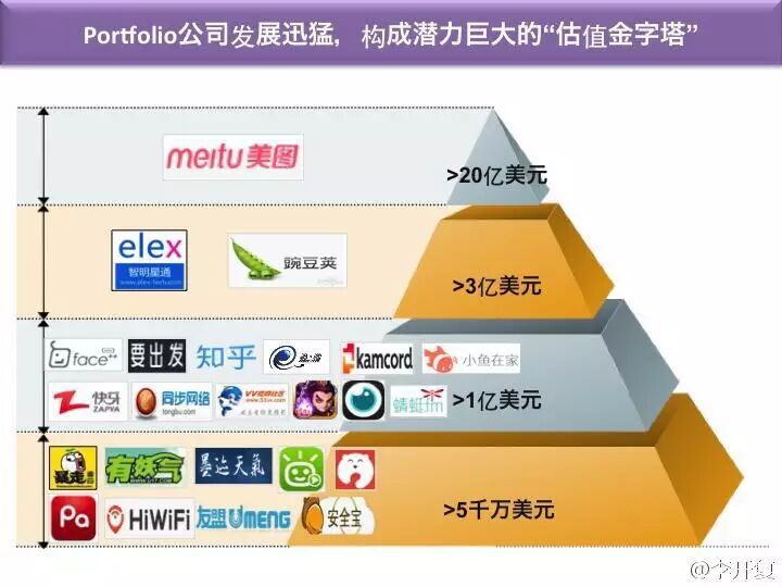 美拍估值超过20亿美元;elex、豌豆荚估值超3亿美元;知乎、蜻蜓FM等估值超1亿美元;有妖气、墨迹天气、友盟、安全宝等估值超5千万美元。